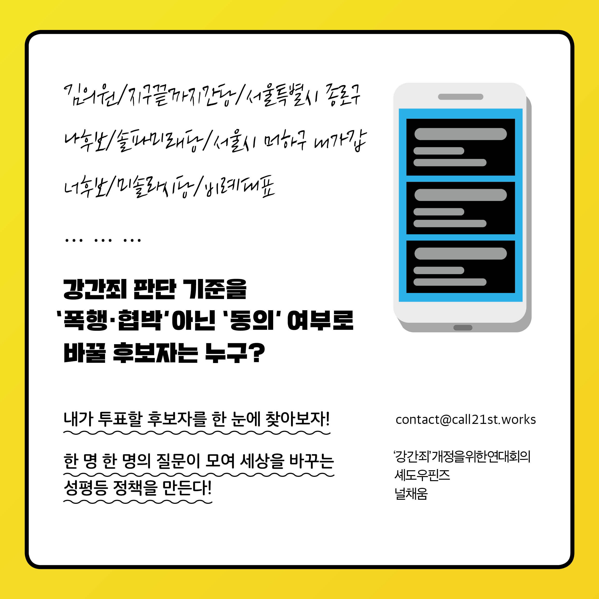 당신의 작은 참여가 성평등한 미래를 만듭니다. 지금 후보에게 질문을 보내보세요.