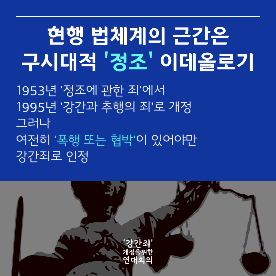 1953년 형법 제정 당시 입법자들은 성폭력을 ‘정조에 관한 죄’로 바라보았고, 여성의 ‘정조’를 소유 가능한 것으로 보는 가부장의 관점에서 현행 법체계를 구축했다. 강간죄 구성요건은 ‘폭행 또는 협박’으로 규정되었는데, 법률가들은 이를 최대한 협소하게 해석해 ‘상대방의 반항을 불가능하게 하거나 현저히 곤란하게 하는(최협의설)’ 폭행 또는 협박이 있어야만 강간으로 인정했다.