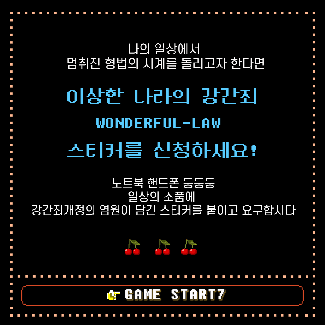 노트북 핸드폰 등등등 일상의 소품에 강간죄 개정의 염원이 담긴 스티커를붙이고 요구합시다.