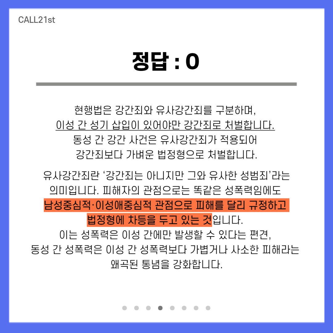 유사강간죄란 ‘강간죄는 아니지만 그와 유사한 성범죄’라는 의미입니다. 피해자의 관점으로는 똑같은 성폭력임에도 남성중심적·이성애중심적 관점으로 피해를 달리 규정하고 법정형에 차등을 두고 있는 것입니다. 이는 성폭력은 이성 간에만 발생할 수 있다는 편견, 동성 간 성폭력은 이성 간 성폭력보다 가볍거나 사소한 피해라는 왜곡된 통념을 강화합니다.
