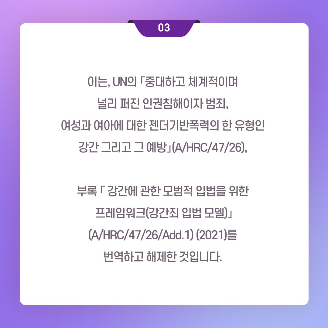 이는 UN의 「중대하고 체계적이며 널리 퍼진 인권침해이자 범죄, 여성과 여아에 대한 젠더기반폭력의 한 유형인 강간 그리고 그 예방」(A/HRC/47/26), 부록 「강간에 관한 모범적 입법을 위한 프레임워크(강간죄 입법 모델)」(A/HRC/47/26/Add/1)(2021)를 번역하고 해제한 것입니다.