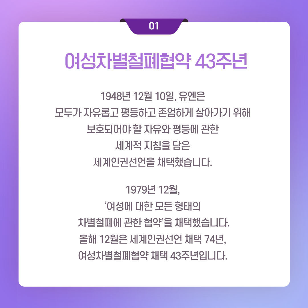 올해 12월은 세계인권선언 채택 74주년, 여성차별철폐협약 채택 43주년입니다.