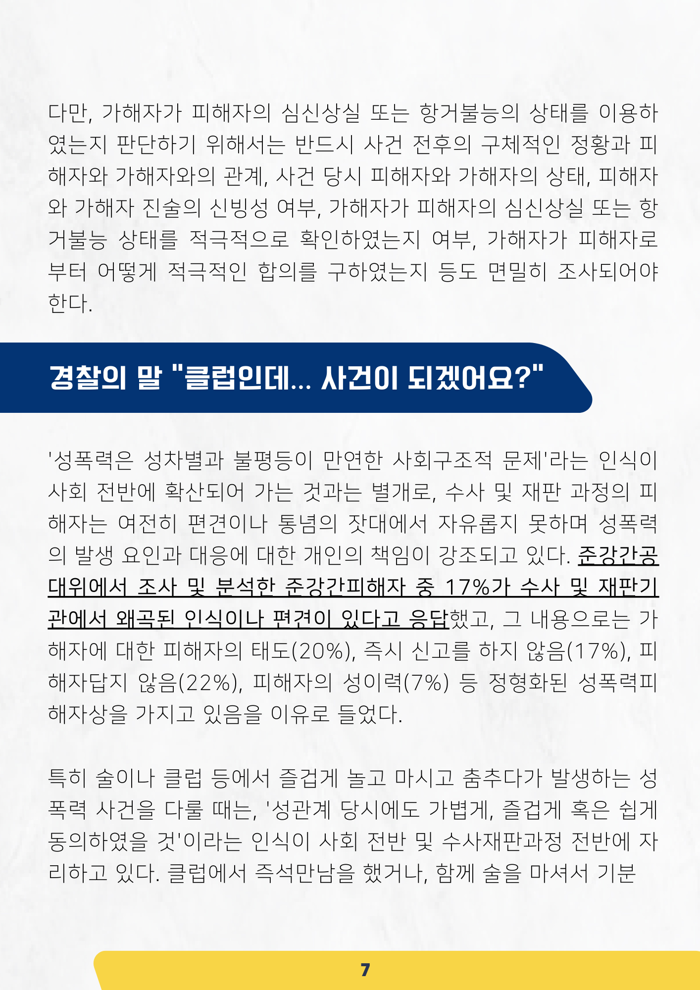 특히 술이나 클럽 등에서 즐겁게 놀고 마시고 춤추다가 발생하는 성폭력 사건을 다룰 때는, '성관계 당시에도 가볍게, 즐겁게 혹은 쉽게 동의하였을 것'이라는 인식이 사회 전반 및 수사재판과정 전반에 자리하고 있다. 클럽에서 즉석만남을 했거나, 함께 술을 마셔서 기분이 좋았거나, 가벼운 스킨십을 했으면 성관계까지 동의할 수 있다는 왜곡된 통념과 성폭력 피해자에 대한 잘못된 편견이 처벌을 막고, 가해자들의 범죄를 방조하고 있다.