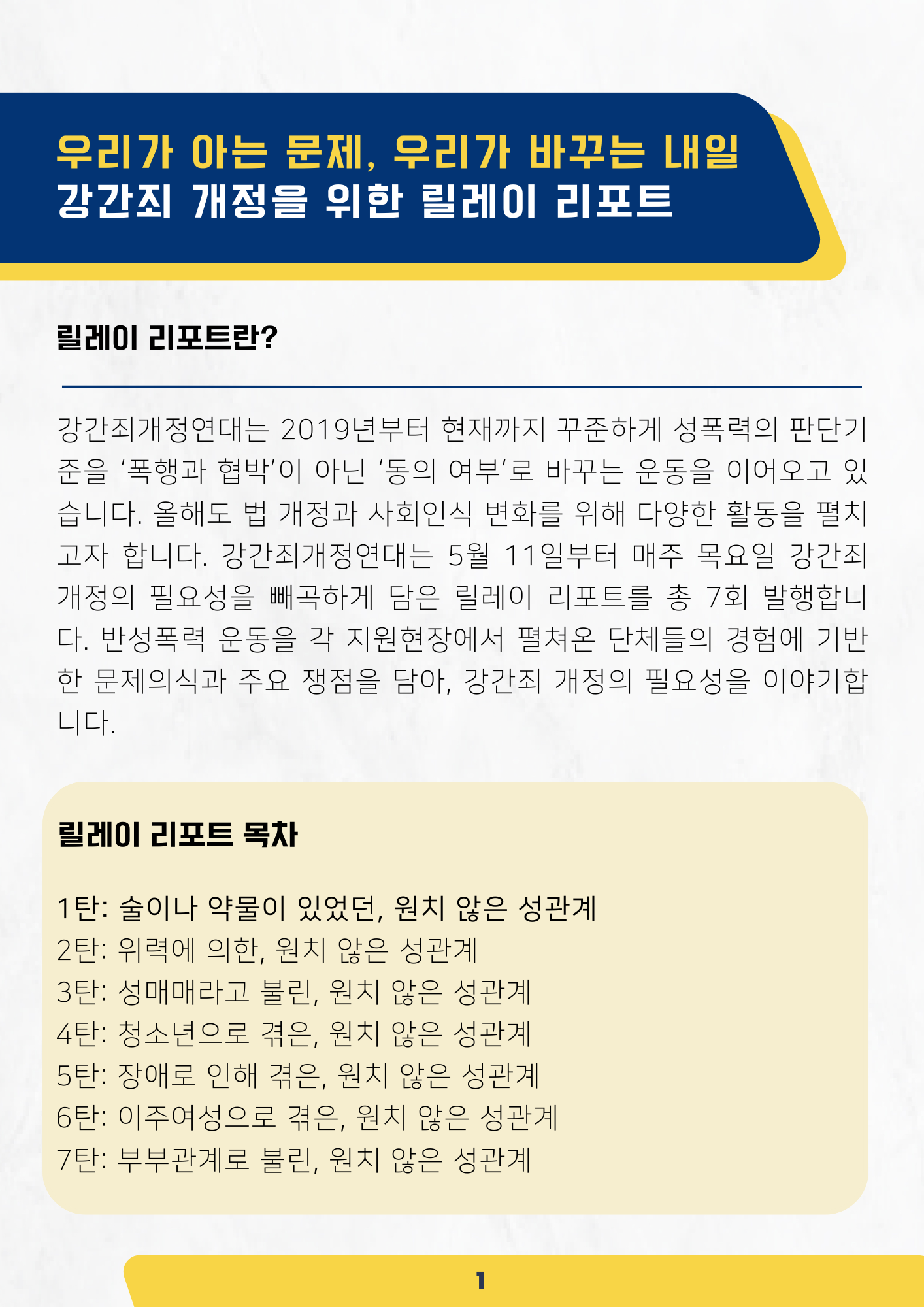 강간죄개정연대는 2019년부터 현재까지 꾸준하게 성폭력의 판단기준을 ‘폭행과 협박’이 아닌 ‘동의 여부’로 바꾸는 운동을 이어오고 있습니다. 올해도 법 개정과 사회인식 변화를 위해 다양한 활동을 펼치고자 합니다. 강간죄개정연대는 5월 11일부터 매주 목요일 강간죄 개정의 필요성을 빼곡하게 담은 릴레이 리포트를 총 7회 발행합니다. 반성폭력 운동을 각 지원현장에서 펼쳐온 단체들의 경험에 기반한 문제의식과 주요 쟁점을 담아, 강간죄 개정의 필요성을 이야기합니다.