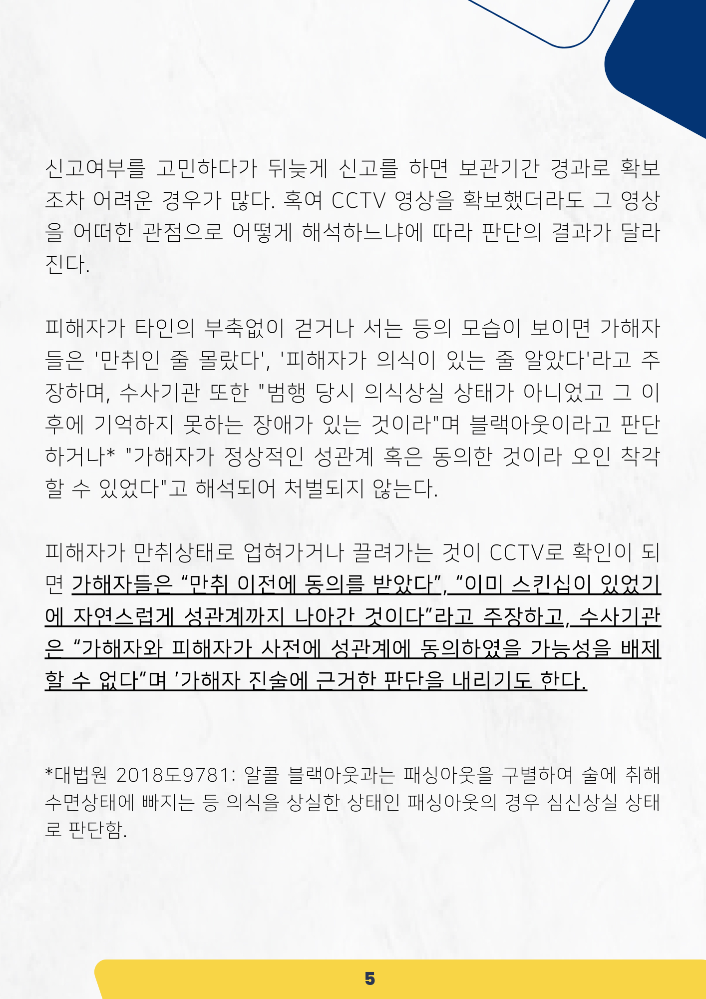 피해자가 만취상태로 업혀가거나 끌려가는 것이 CCTV로 확인이 되면 가해자들은 “만취 이전에 동의를 받았다”, “이미 스킨십이 있었기에 자연스럽게 성관계까지 나아간 것이다”라고 주장하고, 수사기관은 “가해자와 피해자가 사전에 성관계에 동의하였을 가능성을 배제할 수 없다”며 ’가해자 진술에 근거한 판단을 내리기도 한다.