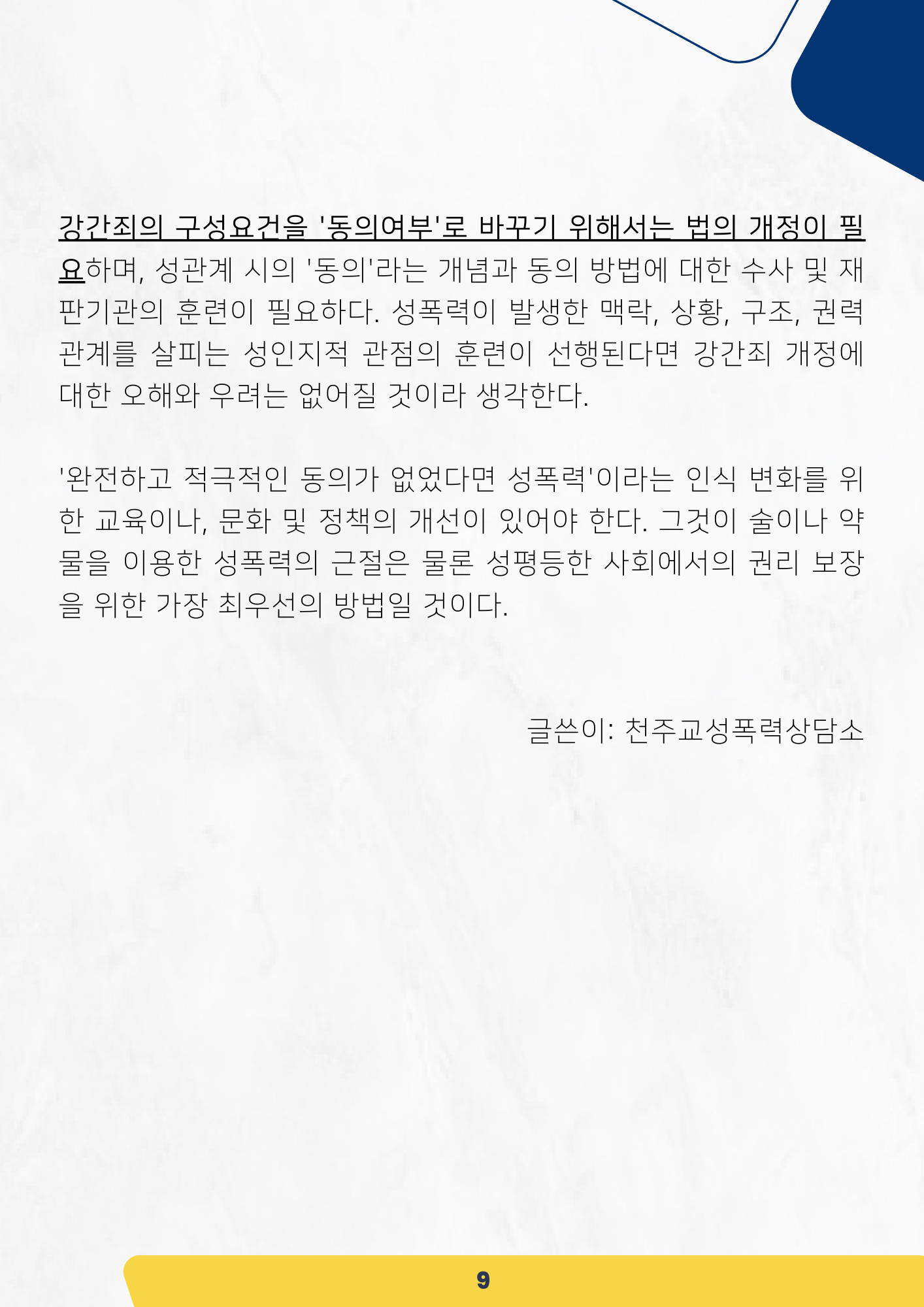 '완전하고 적극적인 동의가 없었다면 성폭력'이라는 인식 변화를 위한 교육이나, 문화 및 정책의 개선이 있어야 한다. 그것이 술이나 약물을 이용한 성폭력의 근절은 물론 성평등한 사회에서의 권리 보장을 위한 가장 최우선의 방법일 것이다.