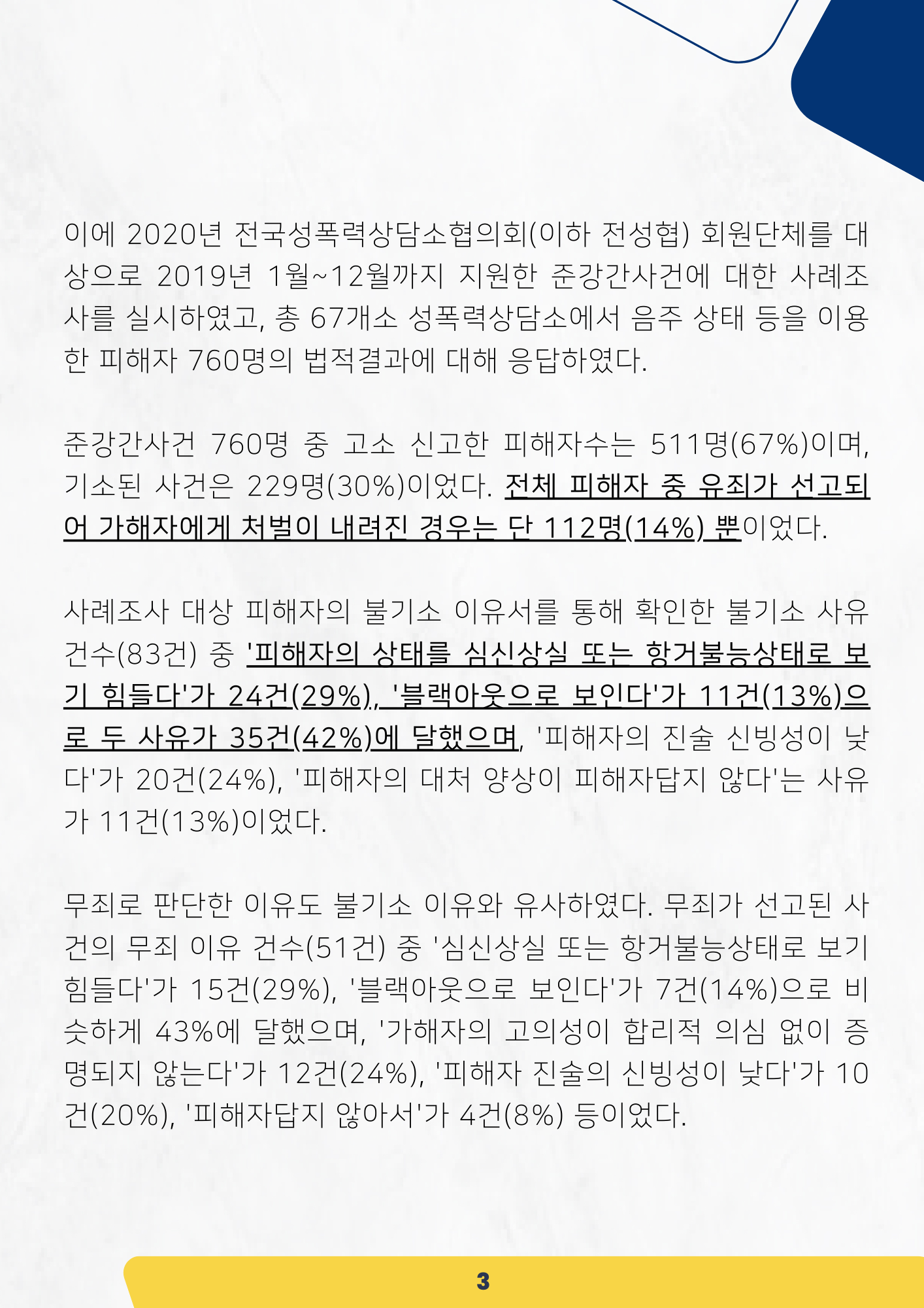 이에 2020년 전국성폭력상담소협의회(이하 전성협) 회원단체를 대상으로 2019년 1월~12월까지 지원한 준강간사건에 대한 사례조사를 실시하였고, 총 67개소 성폭력상담소에서 음주 상태 등을 이용한 피해자 760명의 법적결과에 대해 응답하였다.
