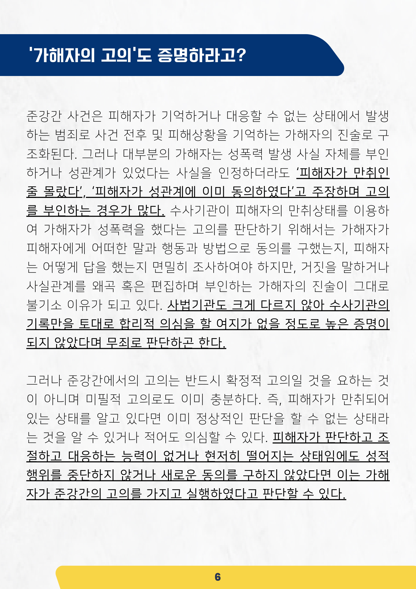 준강간 사건은 피해자가 기억하거나 대응할 수 없는 상태에서 발생하는 범죄로 사건 전후 및 피해상황을 기억하는 가해자의 진술로 구조화된다. 그러나 대부분의 가해자는 성폭력 발생 사실 자체를 부인하거나 성관계가 있었다는 사실을 인정하더라도 ‘피해자가 만취인 줄 몰랐다’, ‘피해자가 성관계에 이미 동의하였다’고 주장하며 고의를 부인하는 경우가 많다. 수사기관이 피해자의 만취상태를 이용하여 가해자가 성폭력을 했다는 고의를 판단하기 위해서는 가해자가 피해자에게 어떠한 말과 행동과 방법으로 동의를 구했는지, 피해자는 어떻게 답을 했는지 면밀히 조사하여야 하지만, 거짓을 말하거나 사실관계를 왜곡 혹은 편집하며 부인하는 가해자의 진술이 그대로 불기소 이유가 되고 있다. 사법기관도 크게 다르지 않아 수사기관의 기록만을 토대로 합리적 의심을 할 여지가 없을 정도로 높은 증명이 되지 않았다며 무죄로 판단하곤 한다.