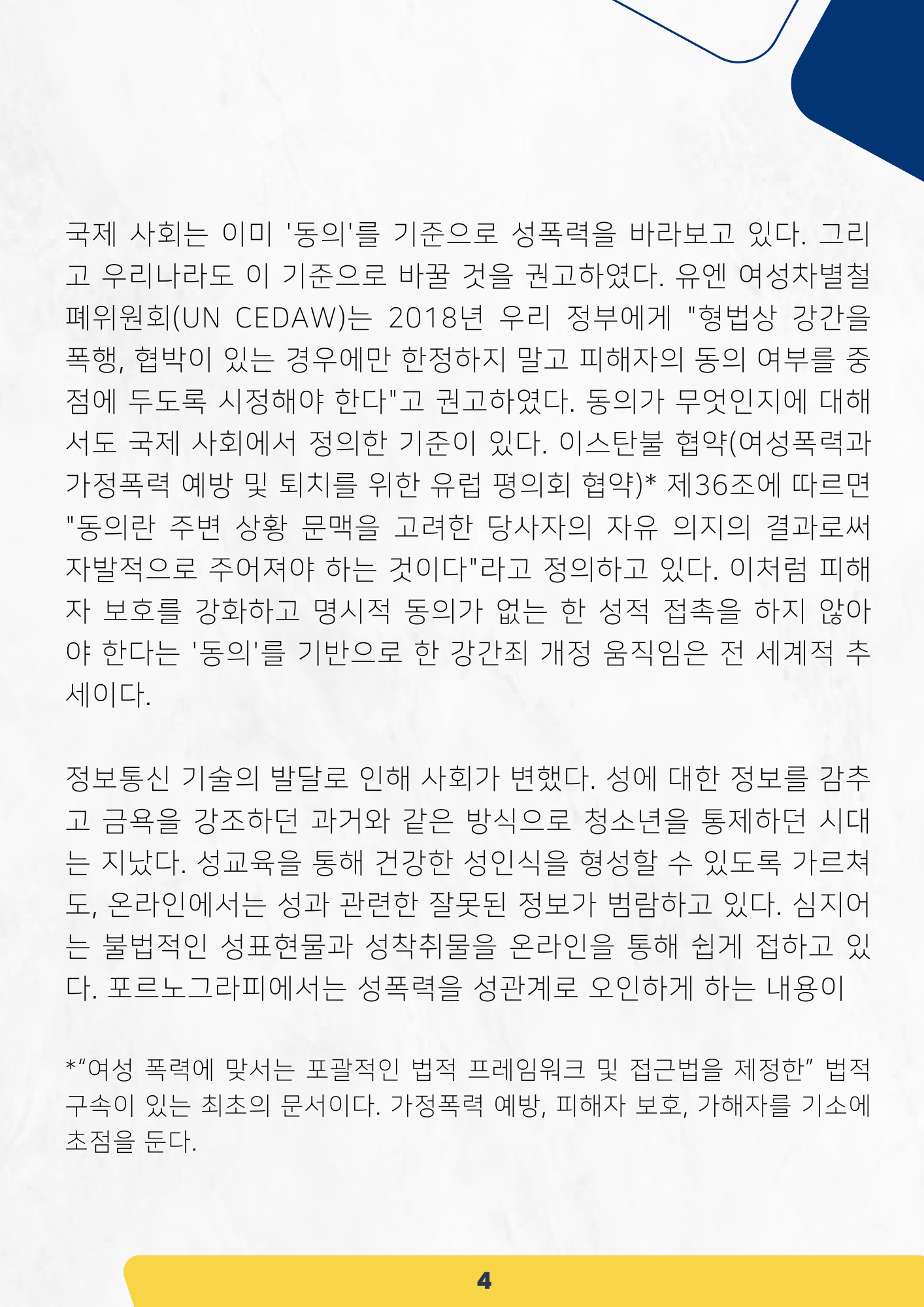 국제 사회는 이미 '동의'를 기준으로 성폭력을 바라보고 있다. 그리고 우리나라도 이 기준으로 바꿀 것을 권고하였다. 유엔 여성차별철폐위원회(UN CEDAW)는 2018년 우리 정부에게 "형법상 강간을 폭행, 협박이 있는 경우에만 한정하지 말고 피해자의 동의 여부를 중점에 두도록 시정해야 한다"고 권고하였다. 동의가 무엇인지에 대해서도 국제 사회에서 정의한 기준이 있다. 이스탄불 협약(여성폭력과 가정폭력 예방 및 퇴치를 위한 유럽 평의회 협약)*** 제36조에 따르면 "동의란 주변 상황 문맥을 고려한 당사자의 자유 의지의 결과로써 자발적으로 주어져야 하는 것이다"라고 정의하고 있다. 이처럼 피해자 보호를 강화하고 명시적 동의가 없는 한 성적 접촉을 하지 않아야 한다는 '동의'를 기반으로 한 강간죄 개정 움직임은 전 세계적 추세이다.