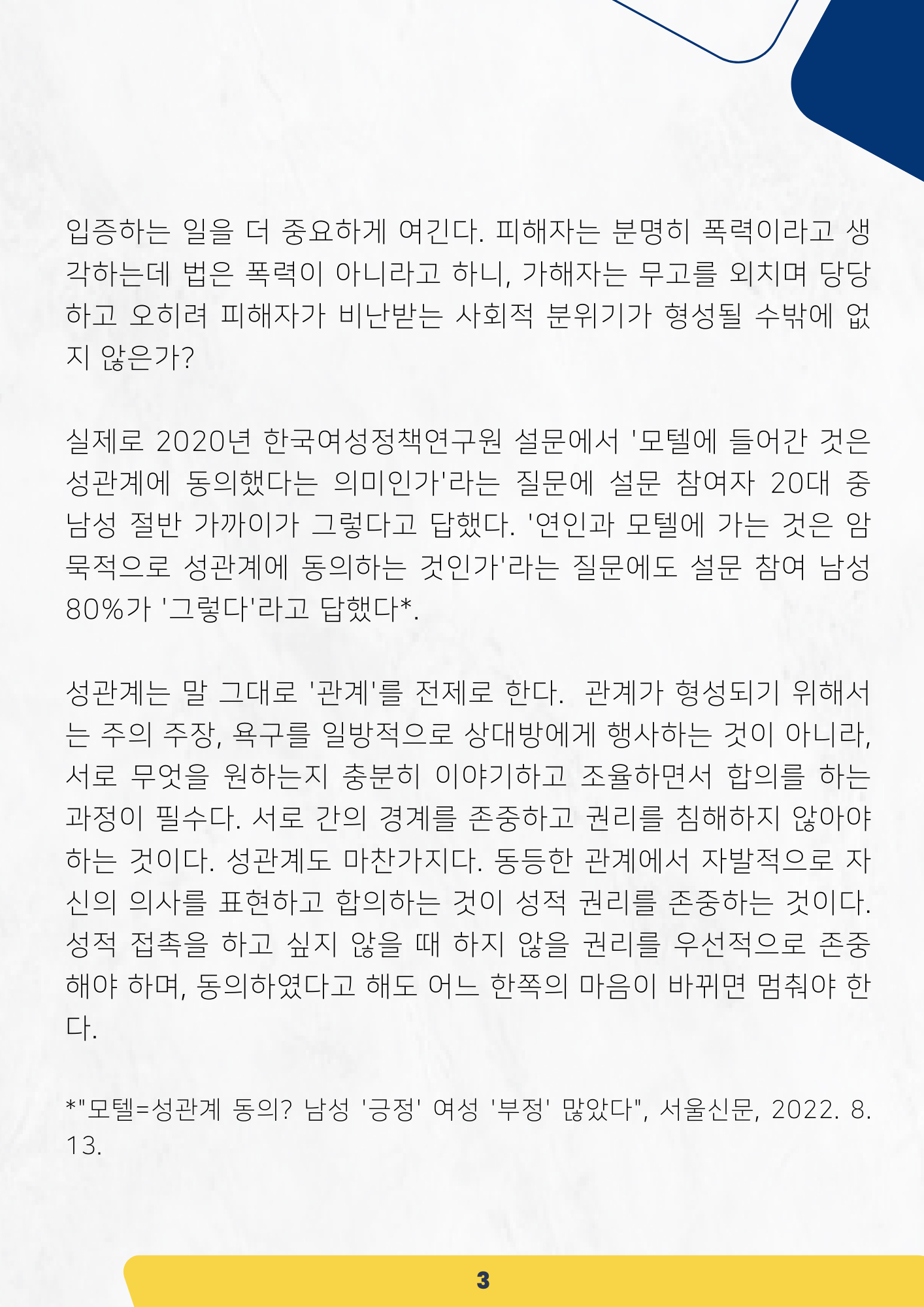 늦었지만 폭력을 폭력이라 하지 않는 법과 사회적 인식을 바꾸고 동의에 관한 논의를 시작하고자 한다. 우리 사회의 구조, 기존 문화, 특정 연령대가 처한 환경 등 다양한 측면을 통합적으로 고려하여 활발한 논의의 장을 열고자 한다. 동의에 대한 논의가 자발적으로 이루어지고 존중받기 위한 환경은 어떠해야 하는지에 대한 고민이 확장될 것이다.