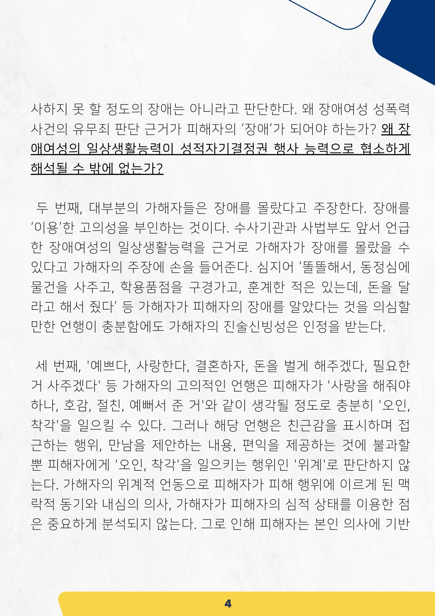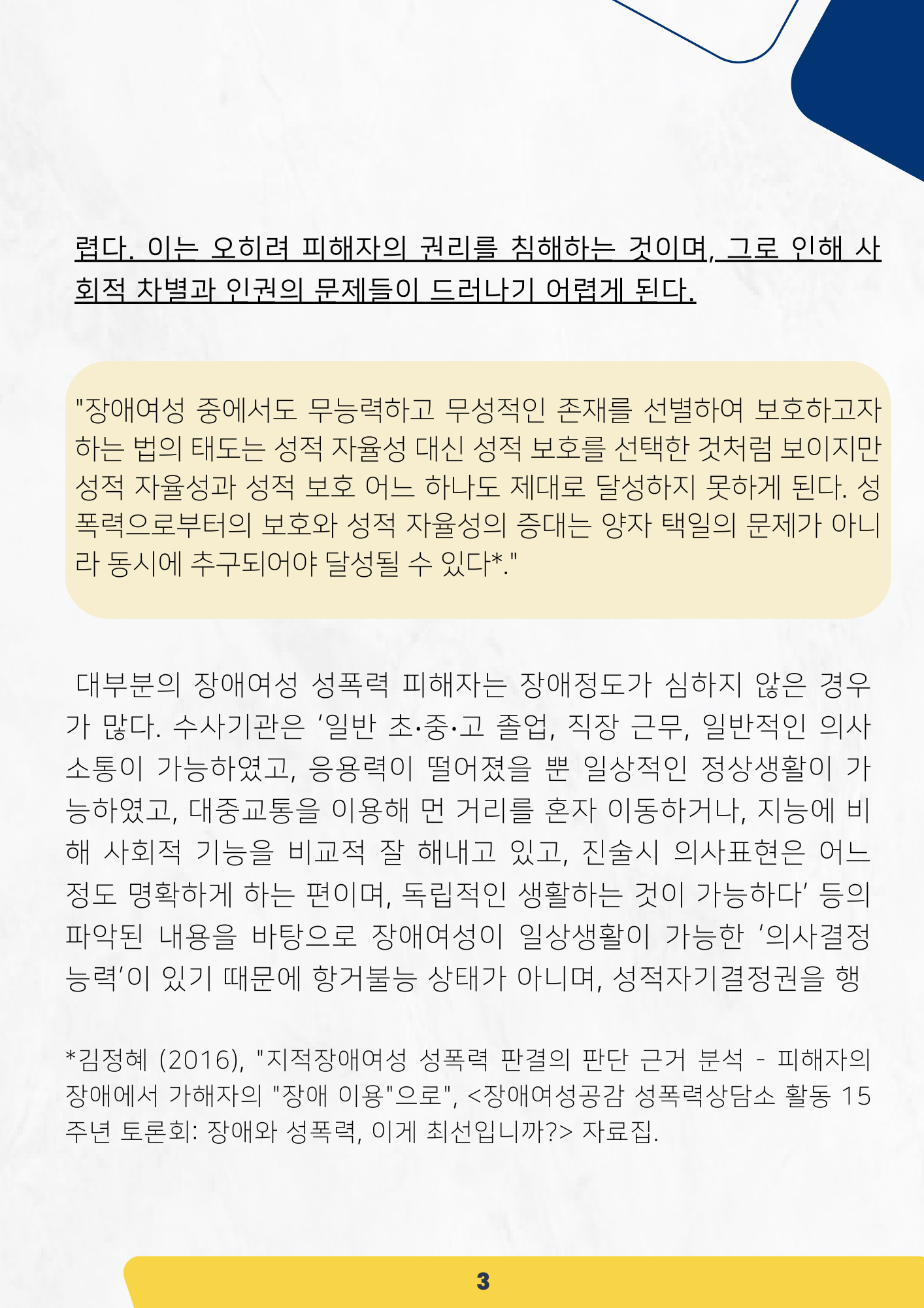 장애여성은 시민, 동료, 친구로서 존중받아본 경험보다 무시와 차별을 일상적으로 경험하며 살아간다. 장애여성 피해자가 피해 당시 가해자의 요구를 참고 들어줌으로써 상대방의 기분을 상하지 않게 하는 것 외에 선택할 수 있는 것은 무엇이 있었을까? 일상의 차별이 내재화되어 있는 장애여성이 본인에게 성적권리가 있고 상대방에게 동의여부를 말하고 선택할 수 있는 사람이라는 경험을 하는 것이 가능할까? 동의의 표현은 자유권에 기반해 진공상태에서 스스로 ‘의지’를 가지고 표현 가능한 ‘능력’의 문제가 아니다. '동의’의 권리는 당연히 존재하지만 그것을 실현시키는 과정은 실패와 연습, 좌절, 지지 등 평등을 위한 대안적 관계와 사회적 조건들이 필요하다. 따라서 국가와 사법부의 책무는 장애여성의 취약성과 능력의 입증이 아닌 취약한 인권의 고리를 찾는 것***이다. 그리고 장애여성의 불평등한 위치성과 구조적 차별에 대한 통합적인 이해에 기반하여 장애여성의 진정한 ‘동의’에 대해 판단할 수 있는 사회적・사법적 역량을 강화하기 위해 강간죄를 개정해야 한다.