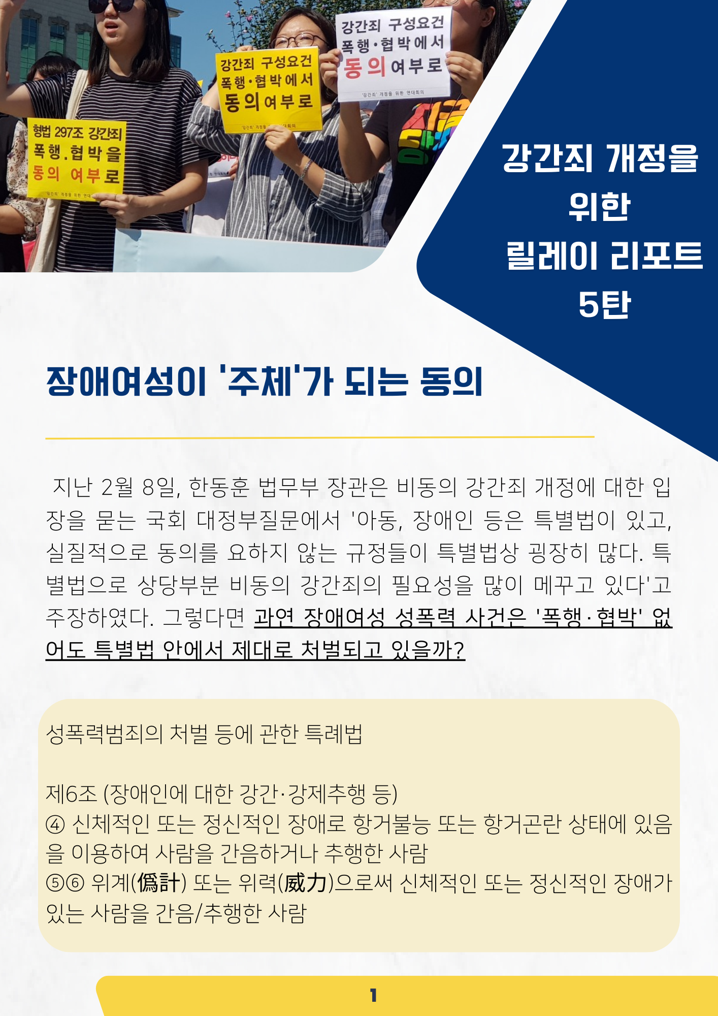 지난 2월 8일, 한동훈 법무부 장관은 비동의 강간죄 개정에 대한 입장을 묻는 국회 대정부질문에서 '아동, 장애인 등은 특별법이 있고, 실질적으로 동의를 요하지 않는 규정들이 특별법상 굉장히 많다. 특별법으로 상당부분 비동의 강간죄의 필요성을 많이 메꾸고 있다'고 주장하였다. 그렇다면 과연 장애여성 성폭력 사건은 '폭행・협박' 없어도 특별법 안에서 제대로 처벌되고 있을까?
