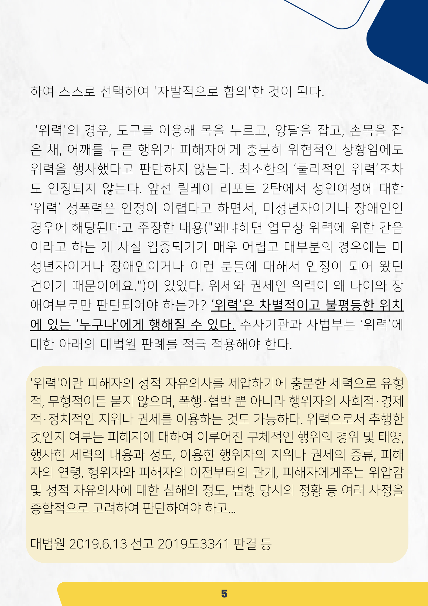 '위력'의 경우, 도구를 이용해 목을 누르고, 양팔을 잡고, 손목을 잡은 채, 어깨를 누른 행위가 피해자에게 충분히 위협적인 상황임에도 위력을 행사했다고 판단하지 않는다. 최소한의 ‘물리적인 위력’조차도 인정되지 않는다. 앞선 릴레이 리포트 2탄에서 성인여성에 대한 ‘위력’ 성폭력은 인정이 어렵다고 하면서, 미성년자이거나 장애인인 경우에 해당된다고 주장한 내용**이 있었다. 위세와 권세인 위력이 왜 나이와 장애여부로만 판단되어야 하는가? ‘위력’은 차별적이고 불평등한 위치에 있는 ‘누구나’에게 행해질 수 있다. 수사기관과 사법부는 ‘위력’에 대한 아래의 대법원 판례를 적극 적용해야 한다.
