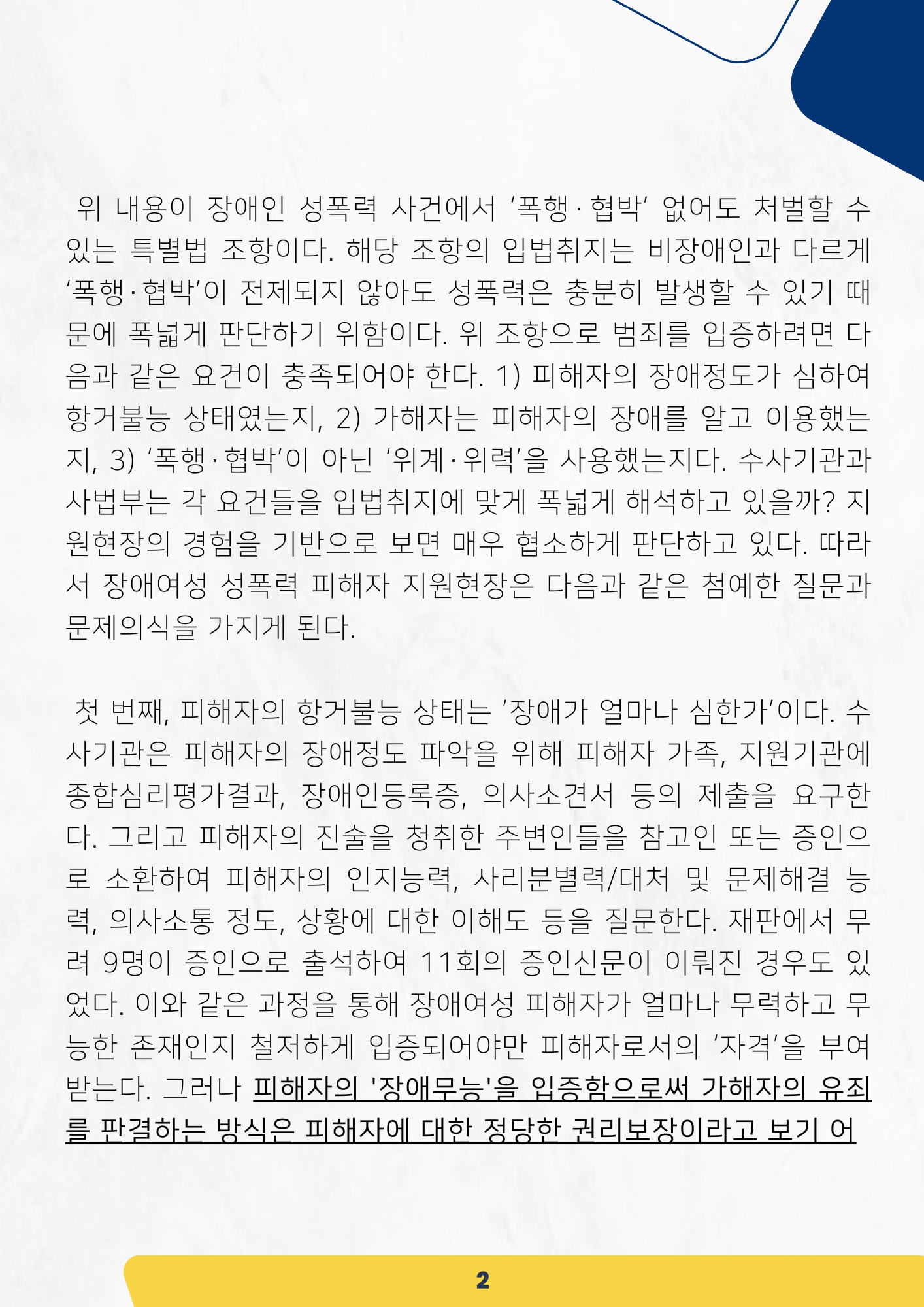 위 내용이 장애인 성폭력 사건에서 ‘폭행・협박’ 없어도 처벌할 수 있는 특별법 조항이다. 해당 조항의 입법취지는 비장애인과 다르게 ‘폭행・협박’이 전제되지 않아도 성폭력은 충분히 발생할 수 있기 때문에 폭넓게 판단하기 위함이다. 위 조항으로 범죄를 입증하려면 다음과 같은 요건이 충족되어야 한다. 1) 피해자의 장애정도가 심하여 항거불능 상태였는지, 2) 가해자는 피해자의 장애를 알고 이용했는지, 3) ‘폭행・협박’이 아닌 ‘위계・위력’을 사용했는지다. 수사기관과 사법부는 각 요건들을 입법취지에 맞게 폭넓게 해석하고 있을까? 지원현장의 경험을 기반으로 보면 매우 협소하게 판단하고 있다. 따라서 장애여성 성폭력 피해자 지원현장은 다음과 같은 첨예한 질문과 문제의식을 가지게 된다.