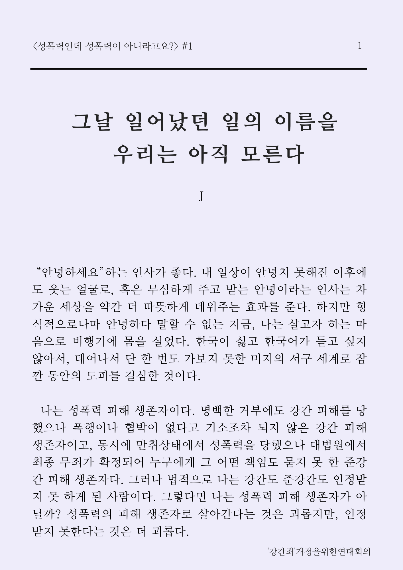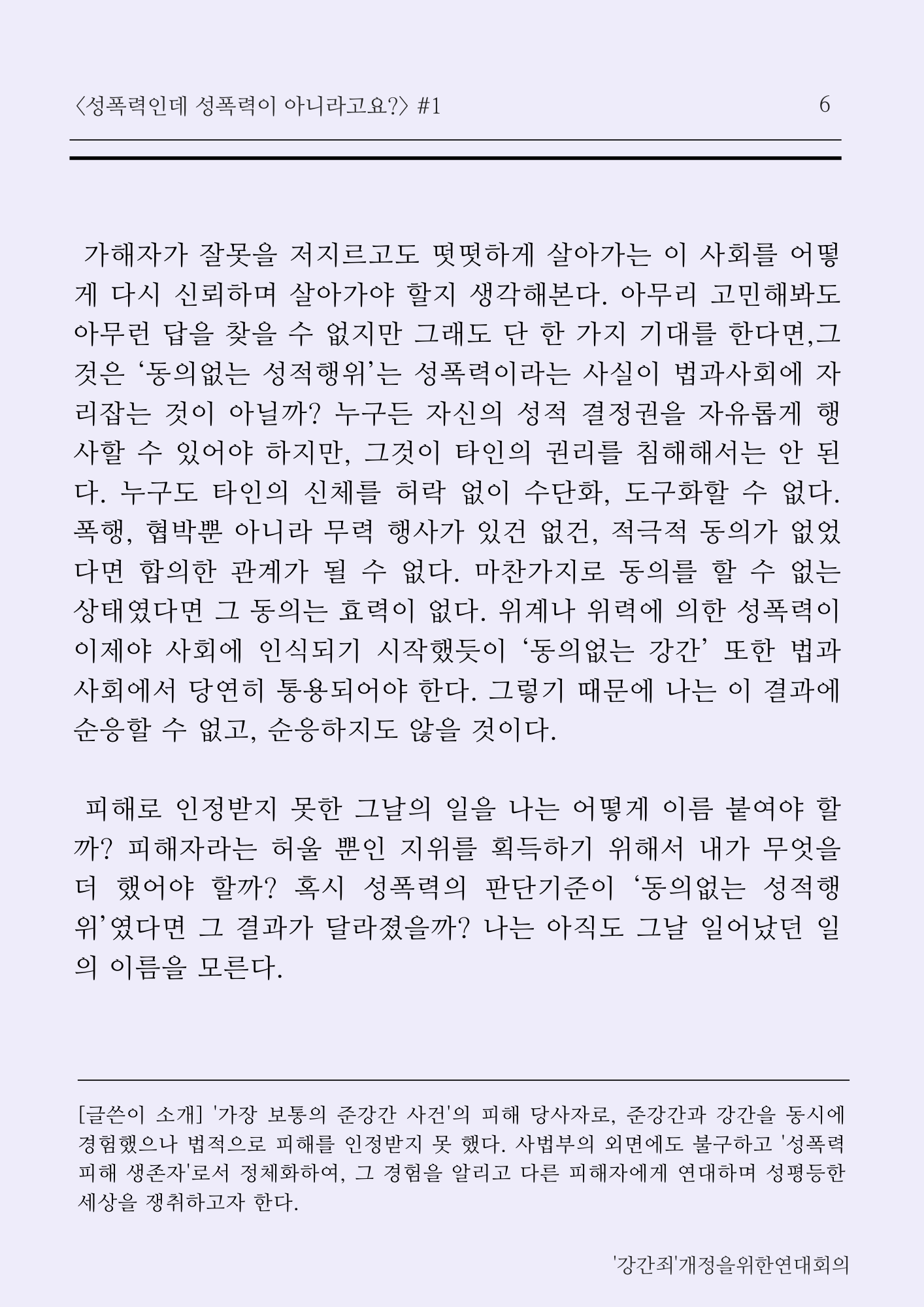 [글쓴이 소개] '가장 보통의 준강간 사건'의 피해 당사자로, 준강간과 강간을 동시에 경험했으나 법적으로 피해를 인정받지 못 했다. 사법부의 외면에도 불구하고 '성폭력피해 생존자'로서 정체화하여, 그 경험을 알리고 다른 피해자에게 연대하며 성평등한 세상을 쟁취하고자 한다.