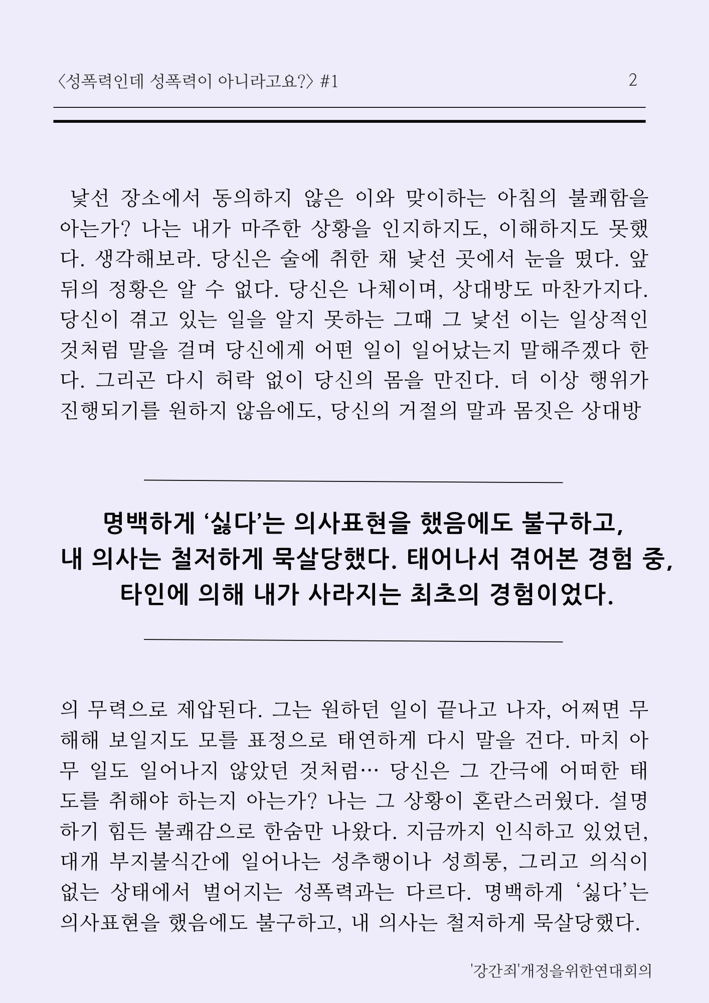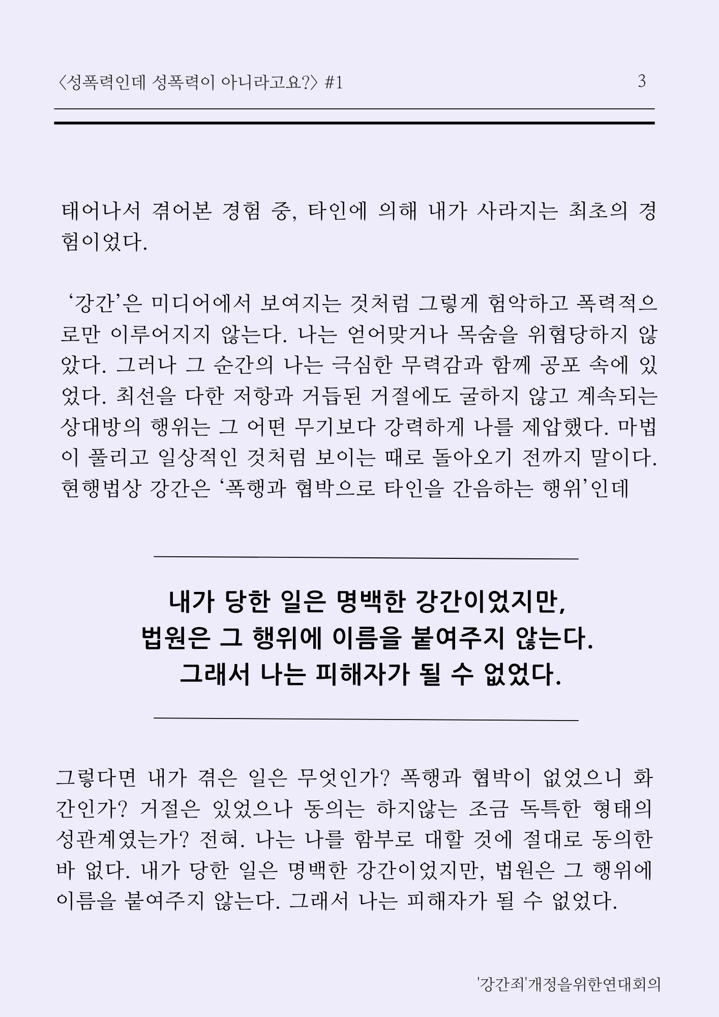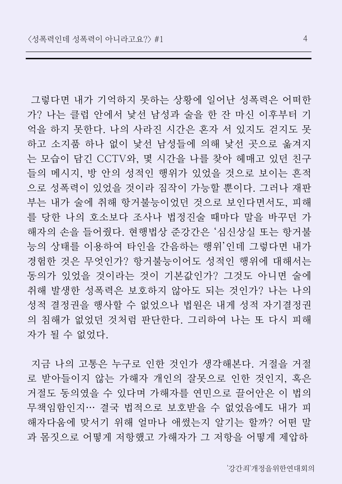 ‘강간’은 미디어에서 보여지는 것처럼 그렇게 험악하고 폭력적으로만 이루어지지 않는다. 나는 얻어맞거나 목숨을 위협당하지 않았다. 그러나 그 순간의 나는 극심한 무력감과 함께 공포 속에 있었다. 최선을 다한 저항과 거듭된 거절에도 굴하지 않고 계속되는 상대방의 행위는 그 어떤 무기보다 강력하게 나를 제압했다. 마법이 풀리고 일상적인 것처럼 보이는 때로 돌아오기 전까지 말이다. 현행법상 강간은 ‘폭행과 협박으로 타인을 간음하는 행위’인데 그렇다면 내가 겪은 일은 무엇인가? 폭행과 협박이 없었으니 화간인가? 거절은 있었으나 동의는 하지않는 조금 독특한 형태의 성관계였는가? 전혀. 나는 나를 함부로 대할 것에 절대로 동의한 바 없다. 내가 당한 일은 명백한 강간이었지만, 법원은 그 행위에 이름을 붙여주지 않는다. 그래서 나는 피해자가 될 수 없었다.