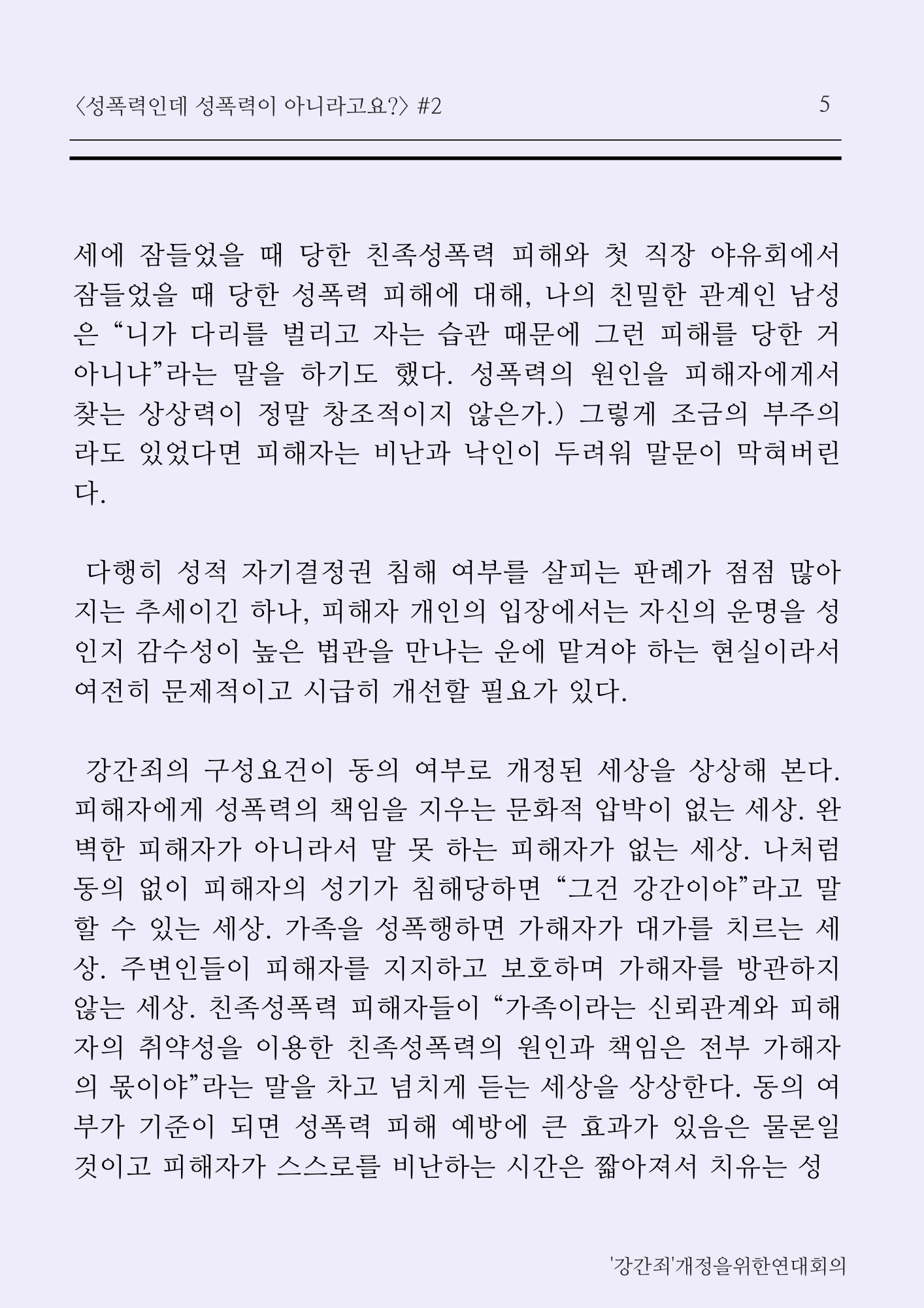 강간죄의 구성요건이 동의 여부로 개정된 세상을 상상해 본다. 피해자에게 성폭력의 책임을 지우는 문화적 압박이 없는 세상. 완벽한 피해자가 아니라서 말 못 하는 피해자가 없는 세상. 나처럼 동의 없이 피해자의 성기가 침해당하면 “그건 강간이야”라고 말할 수 있는 세상. 가족을 성폭행하면 가해자가 대가를 치르는 세상. 주변인들이 피해자를 지지하고 보호하며 가해자를 방관하지 않는 세상. 친족성폭력 피해자들이 “가족이라는 신뢰관계와 피해자의 취약성을 이용한 친족성폭력의 원인과 책임은 전부 가해자의 몫이야”라는 말을 차고 넘치게 듣는 세상을 상상한다. 동의 여부가 기준이 되면 성폭력 피해 예방에 큰 효과가 있음은 물론일 것이고 피해자가 스스로를 비난하는 시간은 짧아져서 치유는 성큼 가까이 다가올 것이다.