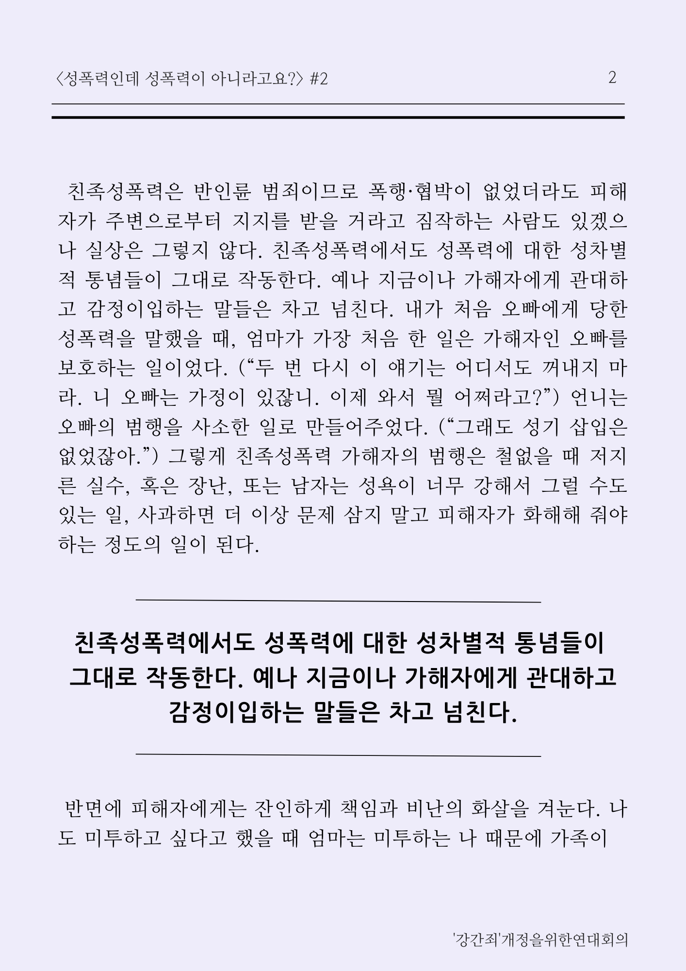 나는 폭행이나 협박이 없는 상황에서 친족성폭력 피해를 당한 많은 사람 중 한 명이다. 나의 친오빠인 가해자는 굳이 수고롭게 폭행이나 협박을 할 필요가 조금도 없었다. 내가 두려움에 완전히 얼어붙어 아무 저항도 하지 못했기 때문이다. 어린 나는, 엄마가 알게 되면 자식들을 버리고 떠날까 봐 두려웠고 수능을 앞둔 오빠의 앞길을 막았다고 비난받을까 봐 두려웠다. 도망갈 곳 없는 내가 할 수 있는 것은 계속 잠든 척하면서 끔찍한 시간이 빨리 지나가기를 기다리는 일뿐이었다.