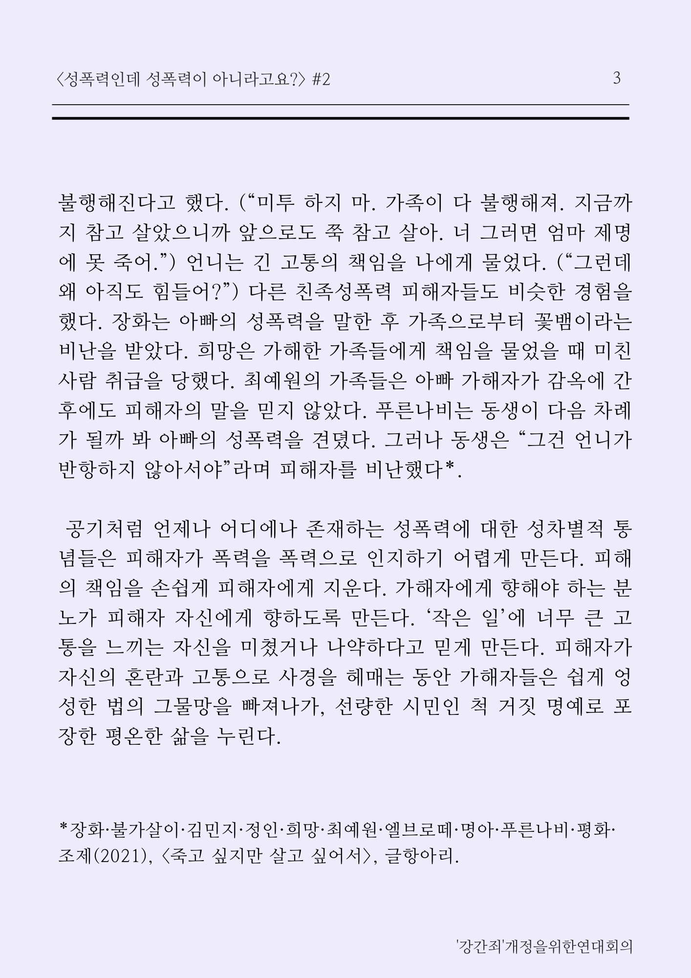 반면에 피해자에게는 잔인하게 책임과 비난의 화살을 겨눈다. 나도 미투하고 싶다고 했을 때 엄마는 미투하는 나 때문에 가족이 불행해진다고 했다. (“미투 하지 마. 가족이 다 불행해져. 지금까지 참고 살았으니까 앞으로도 쭉 참고 살아. 너 그러면 엄마 제명에 못 죽어.”) 언니는 긴 고통의 책임을 나에게 물었다. (“그런데 왜 아직도 힘들어?”) 다른 친족성폭력 피해자들도 비슷한 경험을 했다. 장화는 아빠의 성폭력을 말한 후 가족으로부터 꽃뱀이라는 비난을 받았다. 희망은 가해한 가족들에게 책임을 물었을 때 미친 사람 취급을 당했다. 최예원의 가족들은 아빠 가해자가 감옥에 간 후에도 피해자의 말을 믿지 않았다. 푸른나비는 동생이 다음 차례가 될까 봐 아빠의 성폭력을 견뎠다. 그러나 동생은 “그건 언니가 반항하지 않아서야”라며 피해자를 비난했다*.