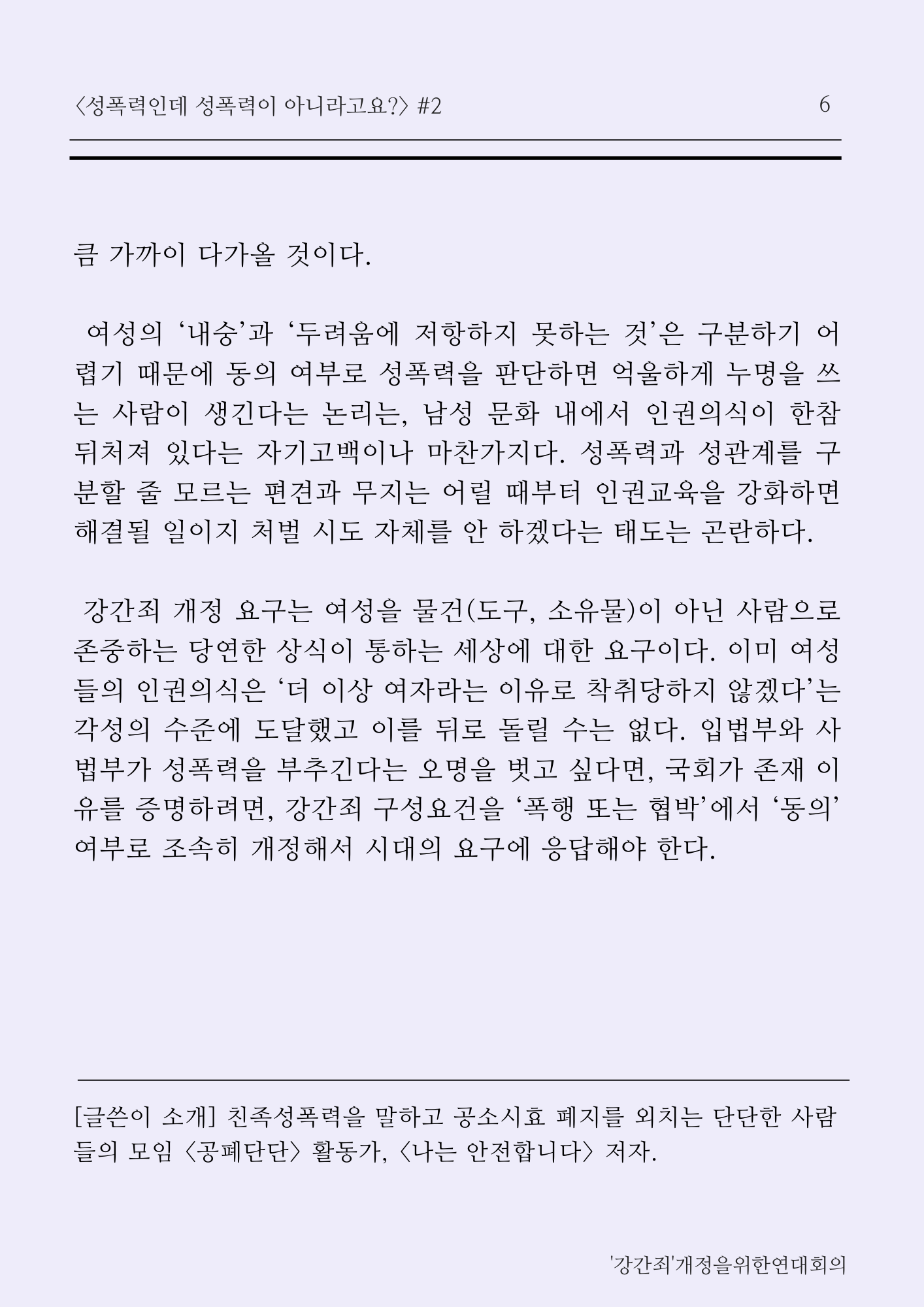 강간죄 개정 요구는 여성을 물건(도구, 소유물)이 아닌 사람으로 존중하는 당연한 상식이 통하는 세상에 대한 요구이다. 이미 여성들의 인권의식은 ‘더 이상 여자라는 이유로 착취당하지 않겠다’는 각성의 수준에 도달했고 이를 뒤로 돌릴 수는 없다. 입법부와 사법부가 성폭력을 부추긴다는 오명을 벗고 싶다면, 국회가 존재 이유를 증명하려면, 강간죄 구성요건을 ‘폭행 또는 협박’에서 ‘동의’ 여부로 조속히 개정해서 시대의 요구에 응답해야 한다.