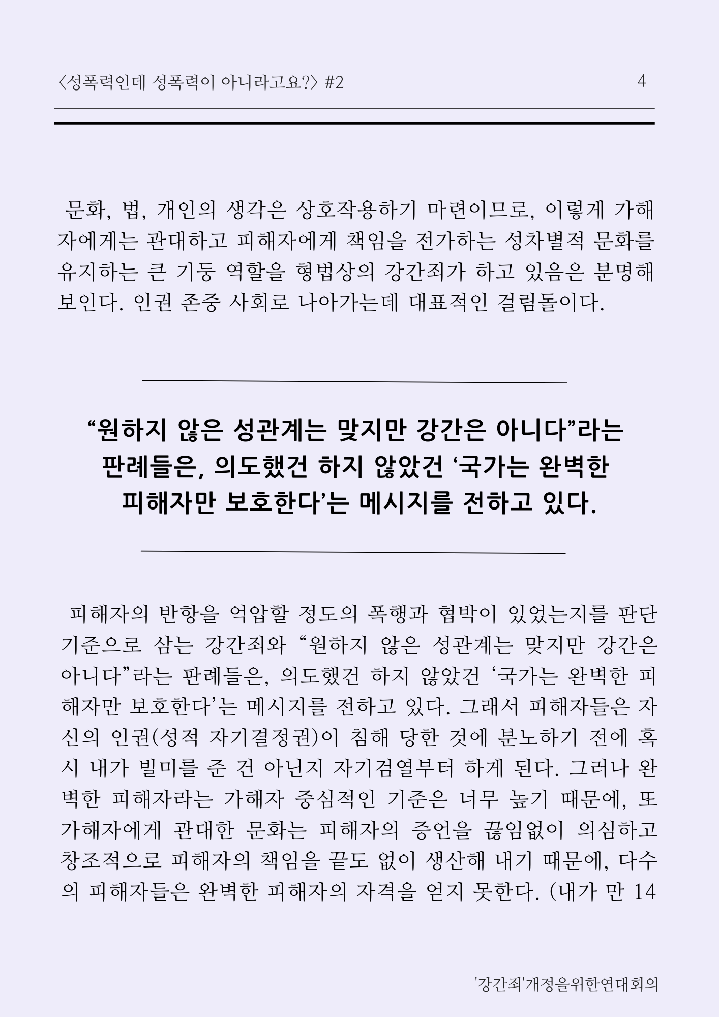 피해자의 반항을 억압할 정도의 폭행과 협박이 있었는지를 판단 기준으로 삼는 강간죄와 “원하지 않은 성관계는 맞지만 강간은 아니다”라는 판례들은, 의도했건 하지 않았건 ‘국가는 완벽한 피해자만 보호한다’는 메시지를 전하고 있다. 그래서 피해자들은 자신의 인권(성적 자기결정권)이 침해 당한 것에 분노하기 전에 혹시 내가 빌미를 준 건 아닌지 자기검열부터 하게 된다. 그러나 완벽한 피해자라는 가해자 중심적인 기준은 너무 높기 때문에, 또 가해자에게 관대한 문화는 피해자의 증언을 끊임없이 의심하고 창조적으로 피해자의 책임을 끝도 없이 생산해 내기 때문에, 다수의 피해자들은 완벽한 피해자의 자격을 얻지 못한다. (내가 만 14세에 잠들었을 때 당한 친족성폭력 피해와 첫 직장 야유회에서 잠들었을 때 당한 성폭력 피해에 대해, 나의 친밀한 관계인 남성은 “니가 다리를 벌리고 자는 습관 때문에 그런 피해를 당한 거 아니냐”라는 말을 하기도 했다. 성폭력의 원인을 피해자에게서 찾는 상상력이 정말 창조적이지 않은가.) 그렇게 조금의 부주의라도 있었다면 피해자는 비난과 낙인이 두려워 말문이 막혀버린다.