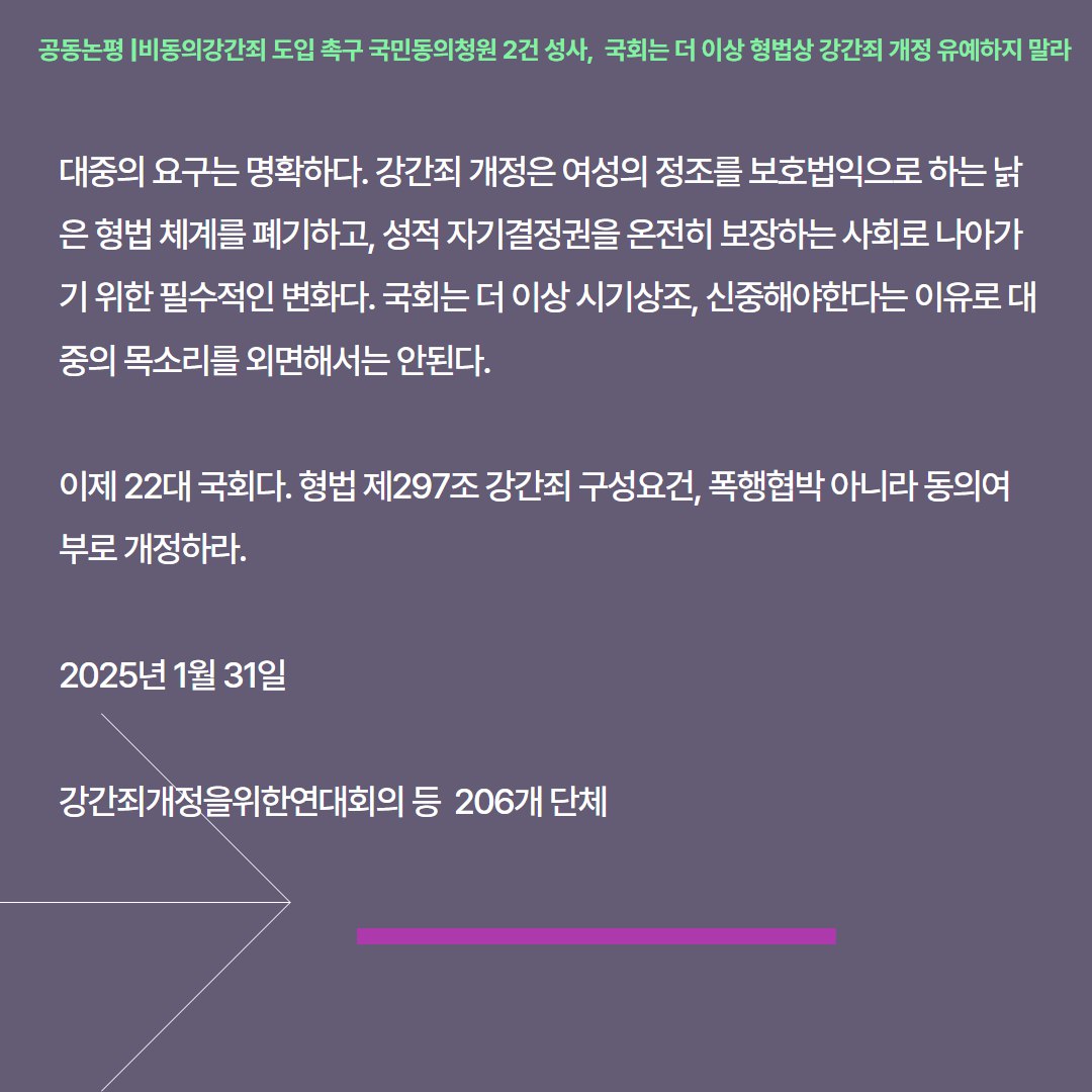 비동의강간죄 도입을 촉구하는 국민동의청원 2건이 성사되었다. <비동의강간죄 동의에 관한 청원>은 1월 29일까지 총 52,160명이 동의하여 지난 1월 20일 22대 국회 법제사법위원회에 회부되었다. <억울한 흙수저 성범죄 피해자, 비동의 강간죄 국회발의 통과 촉구에 관한 청원>역시 50,645명이 동의하여 5만명 이상 동의하면 소관위원회에 회부되는 요건을 충족하였다.